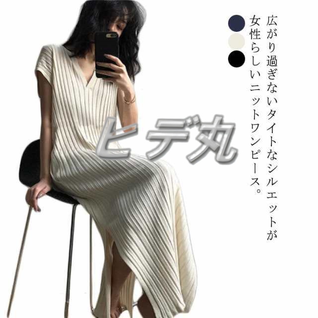 リブニット ワンピース Vネック タイトワンピース レディース サマーニット リブニット 半袖 フレンチスリーブ Iライン スリム シンプル ロング丈 サイドスリット タイト 大人 可愛い セクシー おしゃれ カジュアル オフィス