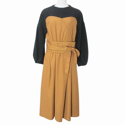 【中古】シンプリシテェ SIMPLICITE ビスチェ風ワンピース ドッキング ロング 長袖 フレア ウエストリボン 黒 茶 X