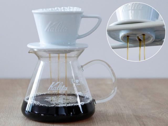 カリタ独自の三つ穴構造のドリッパーは、長時間フィルターとウェーブゾーンにコーヒー液がとどまらず、雑味成分の抽出が少なく美味しさだけをドリップできます。