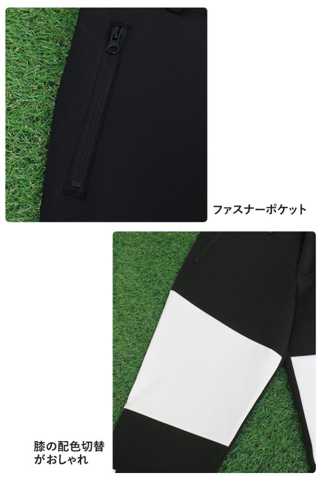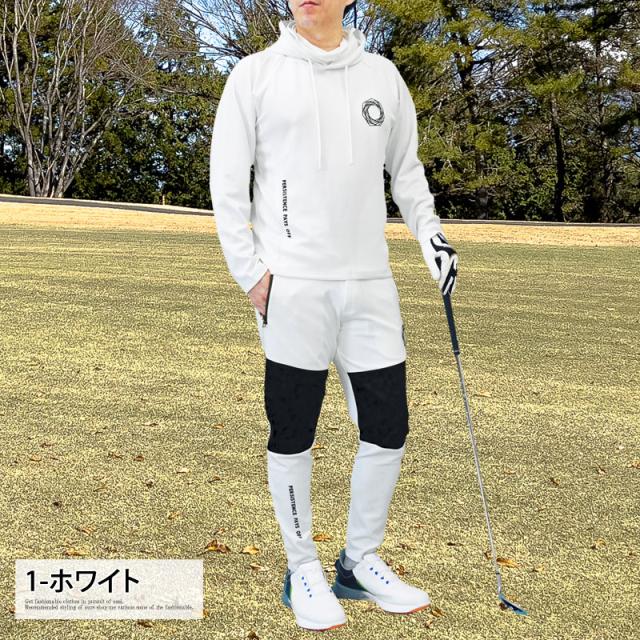 ネックにマスクを搭載したゴルフパーカーと膝の配色切替がおしゃれなゴルフパンツの上下セットアップ。