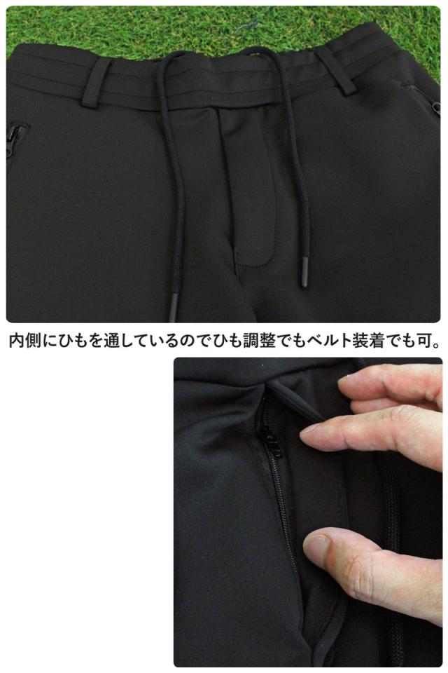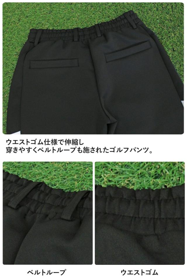 ウエストゴム仕様で伸縮し穿きやすくベルトループも施されたメンズゴルフウェア。