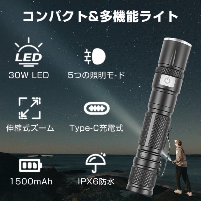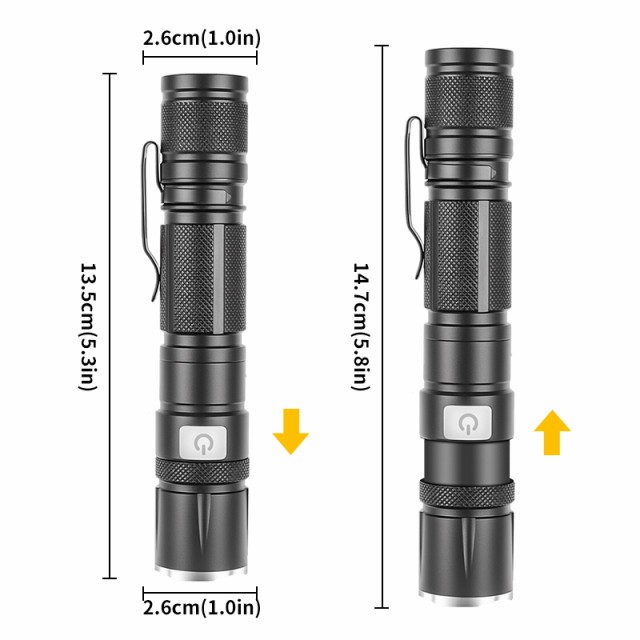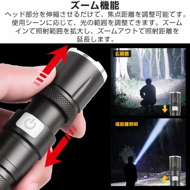 LED懐中電灯 軍用 最強1200ルーメン ズーム 超強力 USB充電式 1500mAh アルミニウム合金材質 軽量 小型 明るい