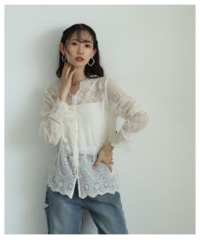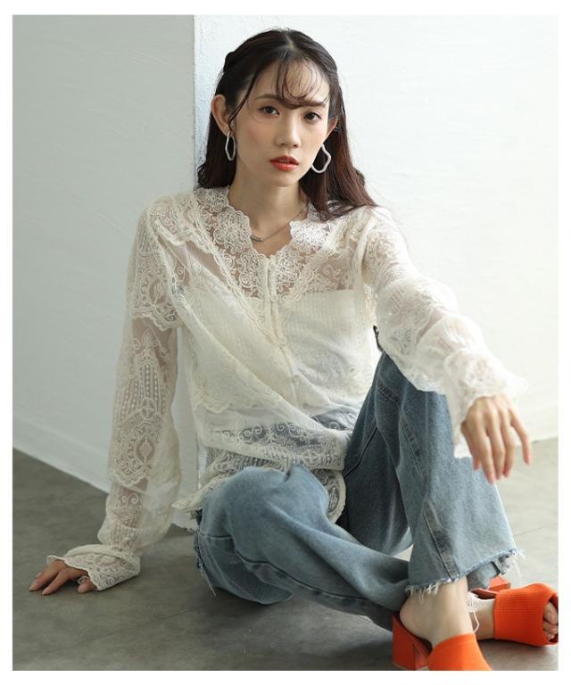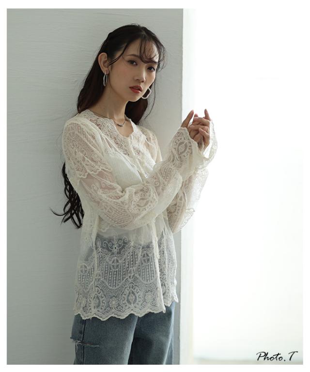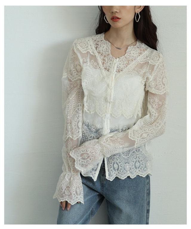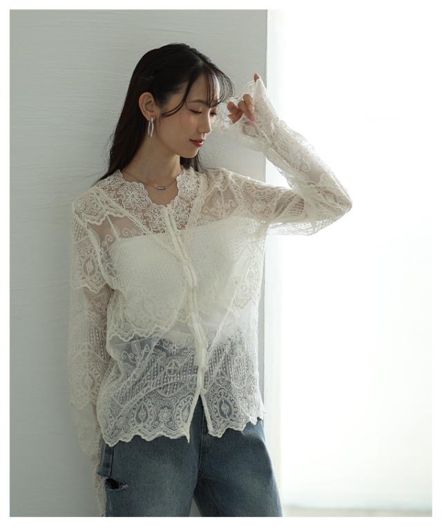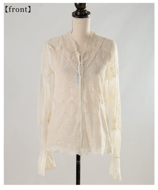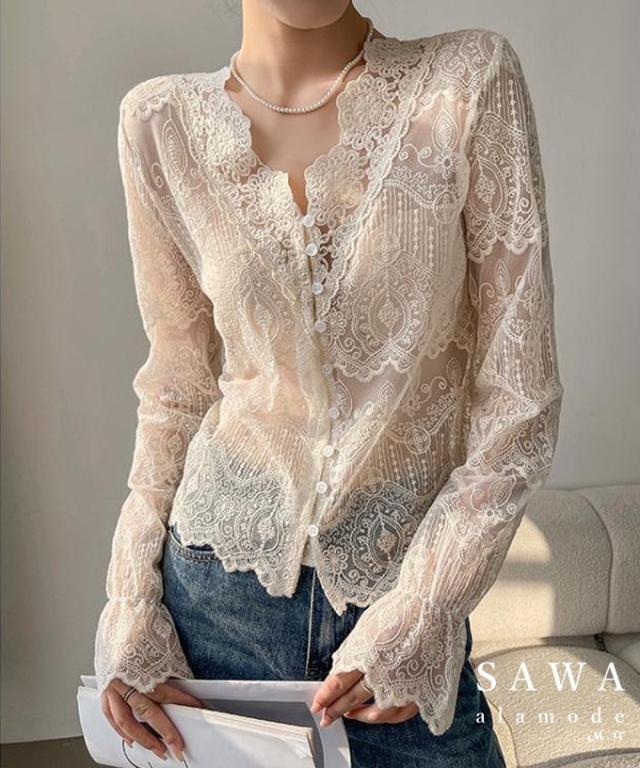 春新作 総レース×スカラップデザインシアーブラウス レディース ファッション トップス ブラウス レース スカラップ シアー 長袖 Vネック フレア 重ね着 30代 40代 50代 60代 サワアラモード sawaalamode otona 大人 cawaii 可愛い 洋服 かわいい服 mode-10016