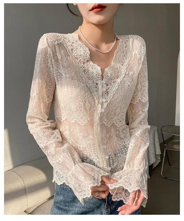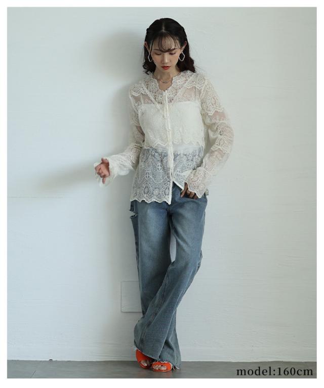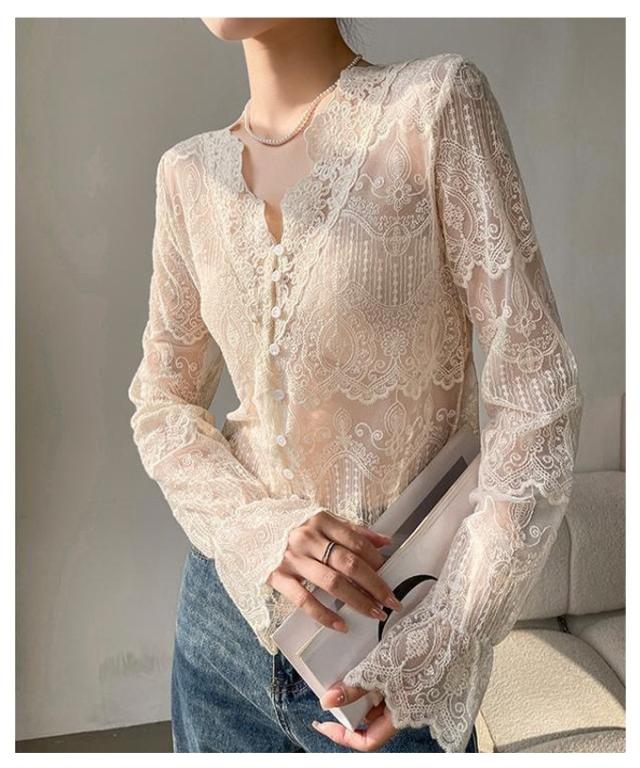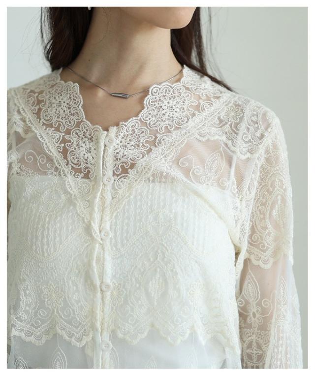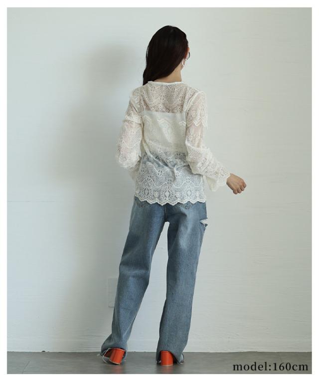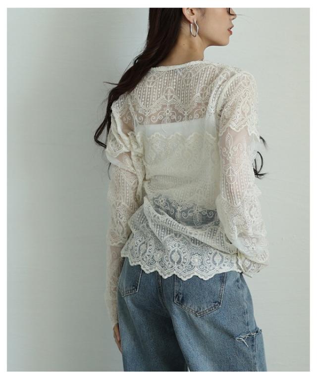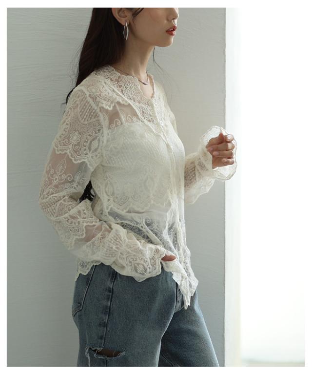 春新作 総レース×スカラップデザインシアーブラウス レディース ファッション トップス ブラウス レース スカラップ シアー 長袖 Vネック フレア 重ね着 30代 40代 50代 60代 サワアラモード sawaalamode otona 大人 cawaii 可愛い 洋服 かわいい服 mode-10016