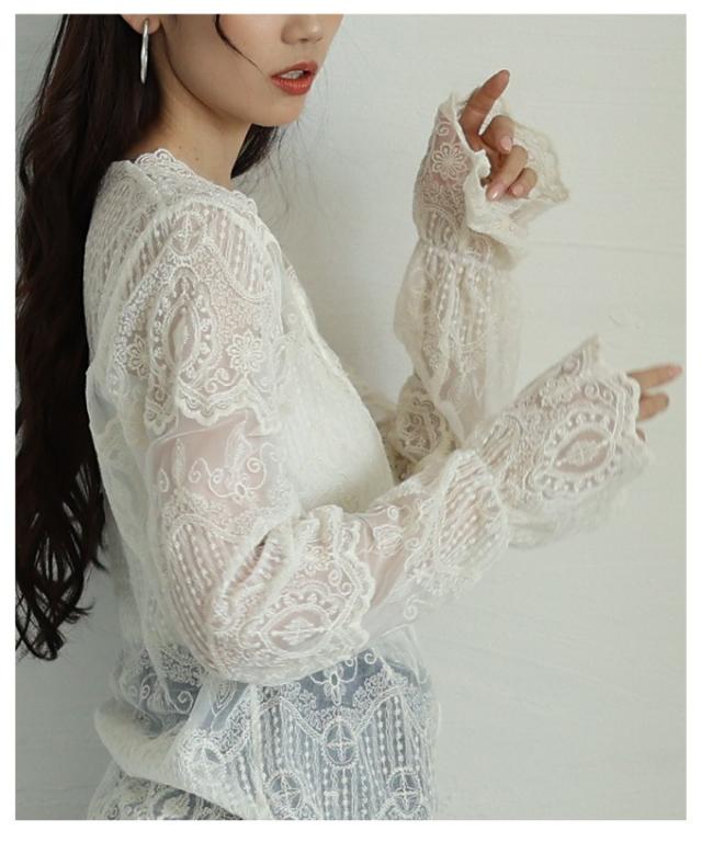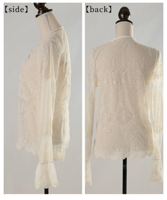 特徴: 総レース スカラップ フレア シアー Vネック ボタン 袖口ゴム 刺繍