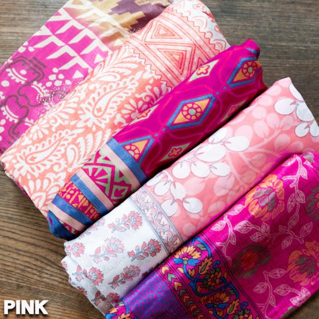 オールドサリーを縫い合わせているので、すべて1点物になります。色の組み合わせは、同じものが存在しないまさに世界で1枚だけのもの。どんな色の組み合わせが届くか、お楽しみ下さい。尚、すべて1点もののためアソートでのお届けとなります。具体的な柄や色の指定はお受けできかねますのでご了承くださいませ。