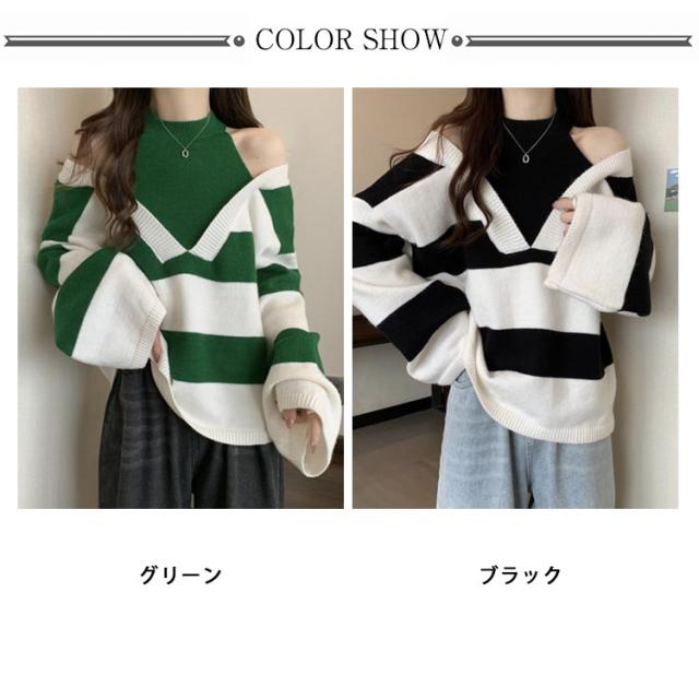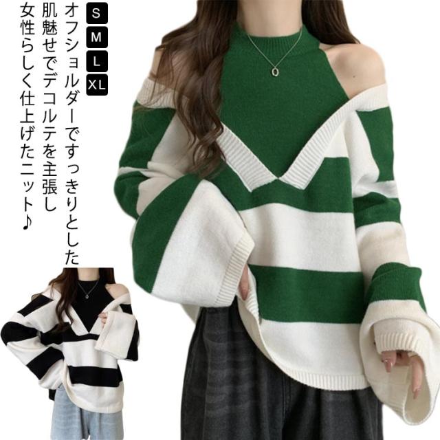 オフショルダー ニット レデイース ボーダーニット セーター フェイクレイヤード 重ね着風 肩出し ニット 長袖 トップス バイカラー 肩見せ セーター ドルマンスリーブ 体型カバー お尻が隠れる シンプル きれいめ カジュアル オフィス デート服