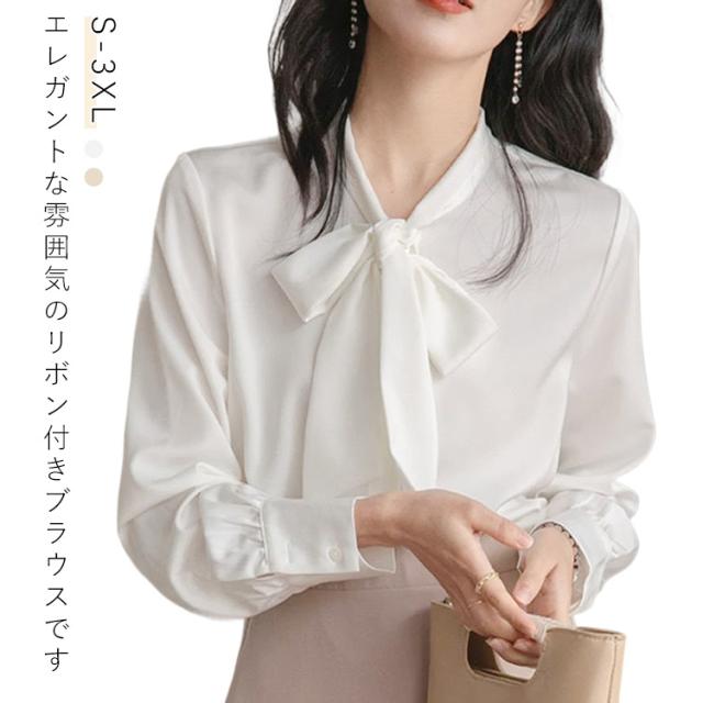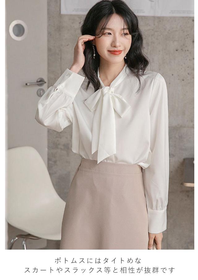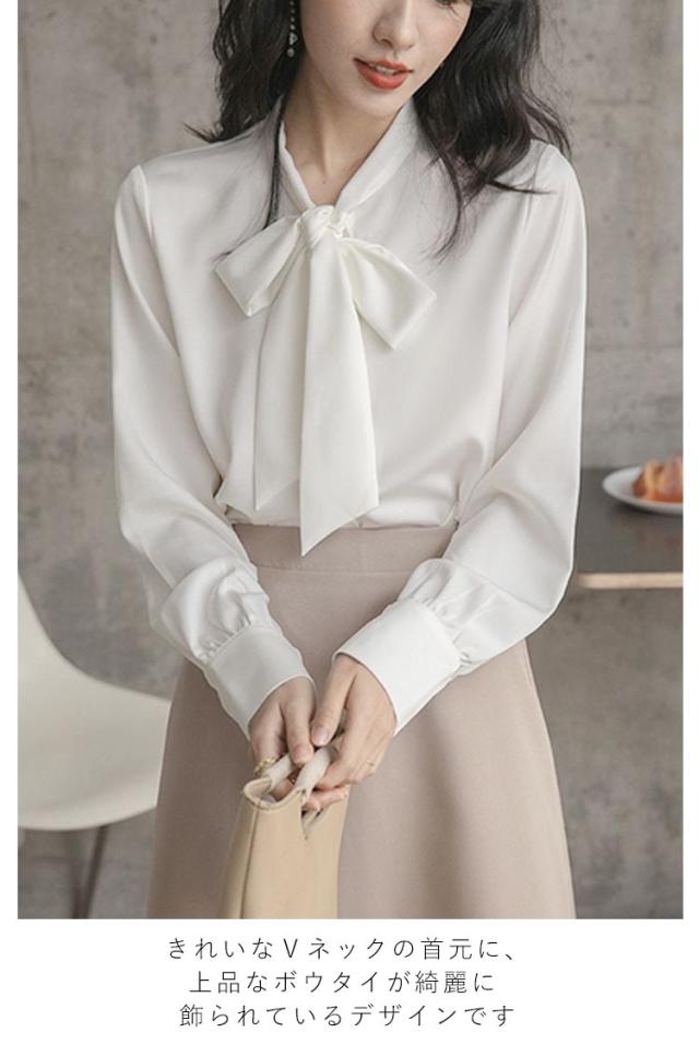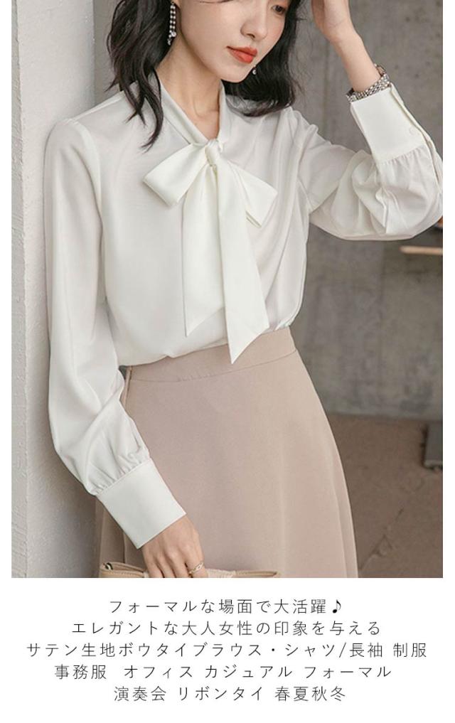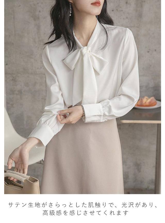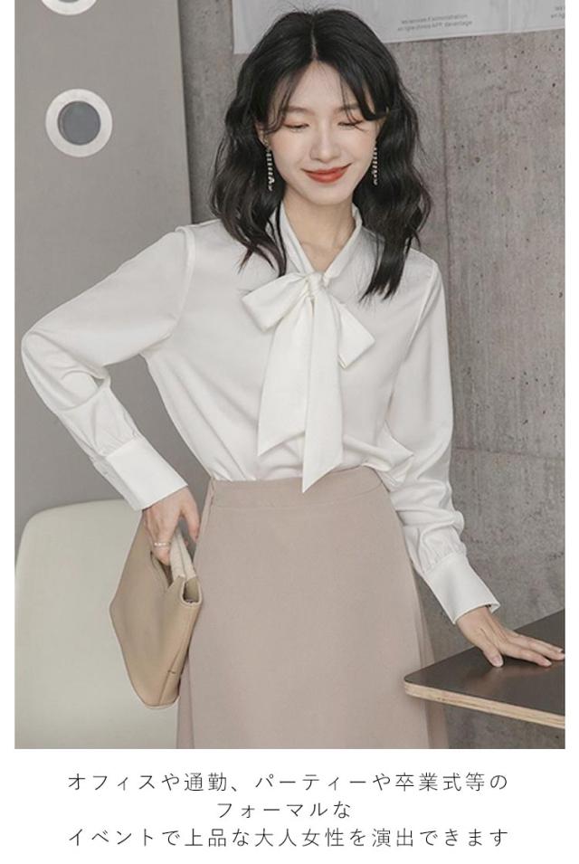 ブラウス レディース 長袖 ボウタイブラウス リボンタイ トップス シャツ 春 秋 シフォン ボウタイ シャーリング リボン付き シャツ フォーマル とろみ素材 ゆったり 無地 オケーション きれいめ トップス 白 母 ビジネススーツ フォーマル ビジネス 通勤 送料無料