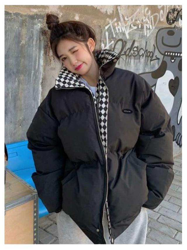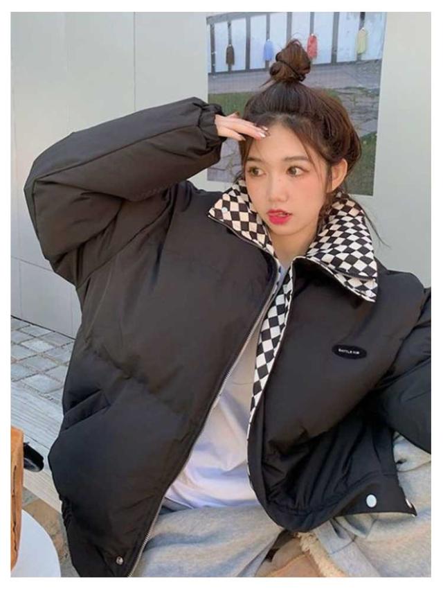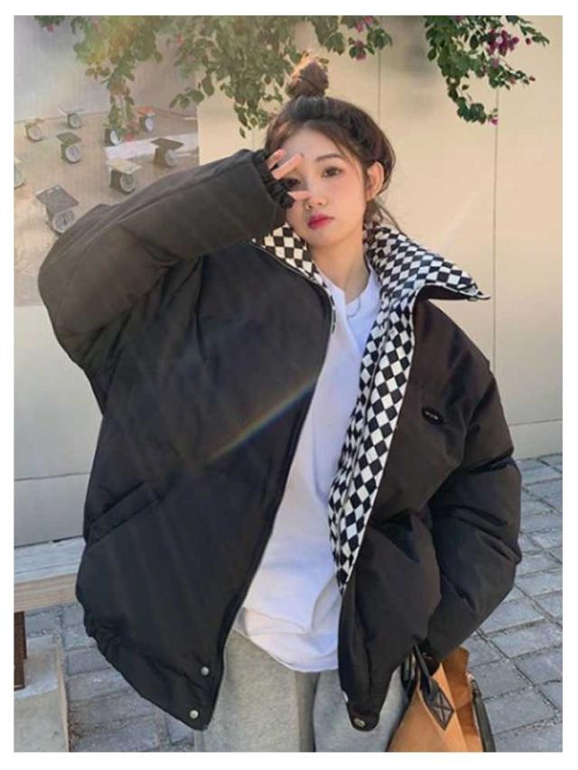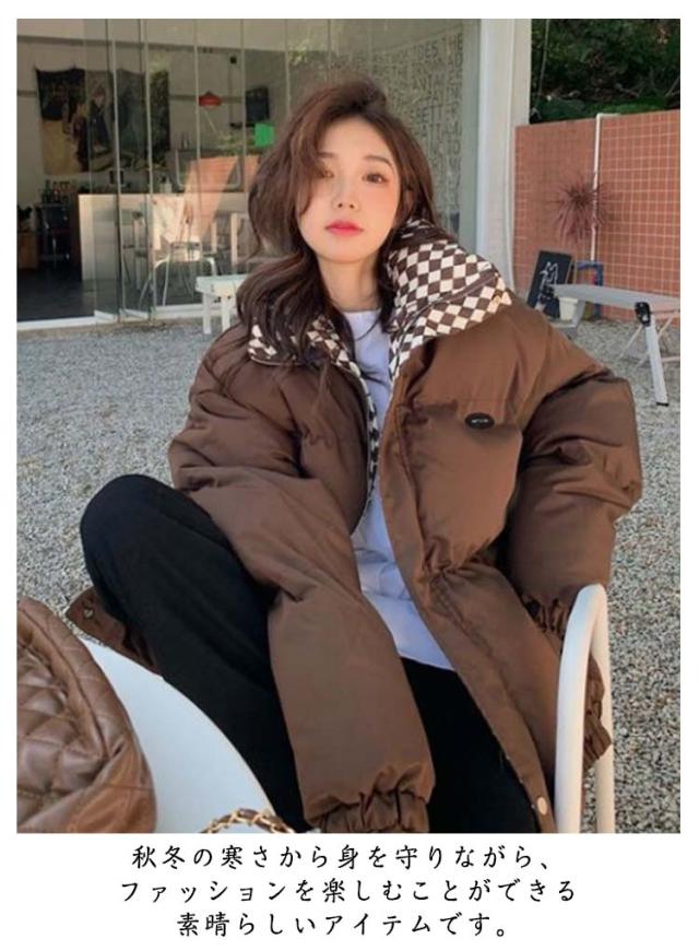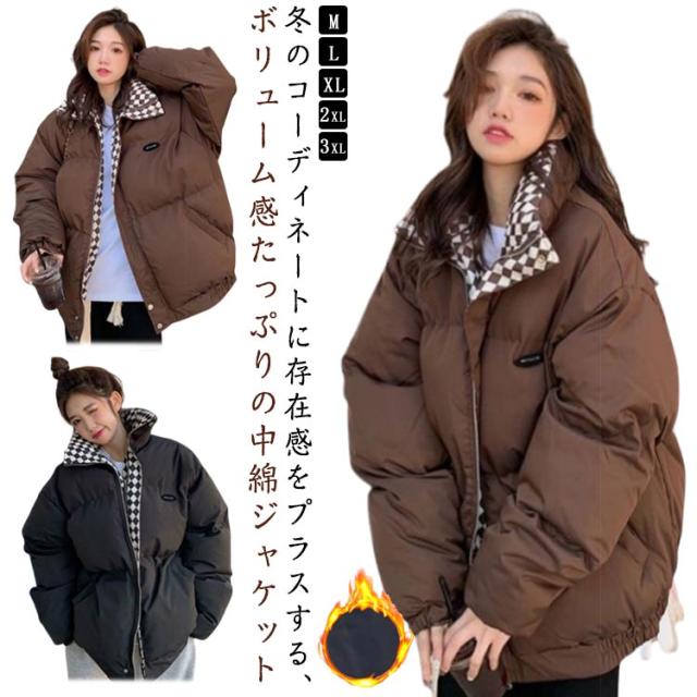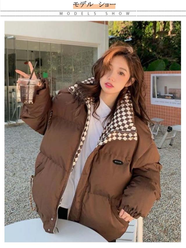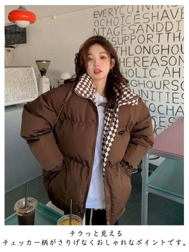 中綿ジャケット チェック柄 配色 スタンドカラー 立ち襟 レディース 厚手 アウター B系 ヒップホップ 防寒 カジュアル 通学 女子 学生 暖かい ボリューム 冬