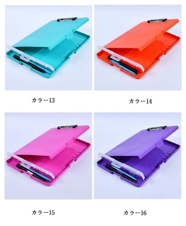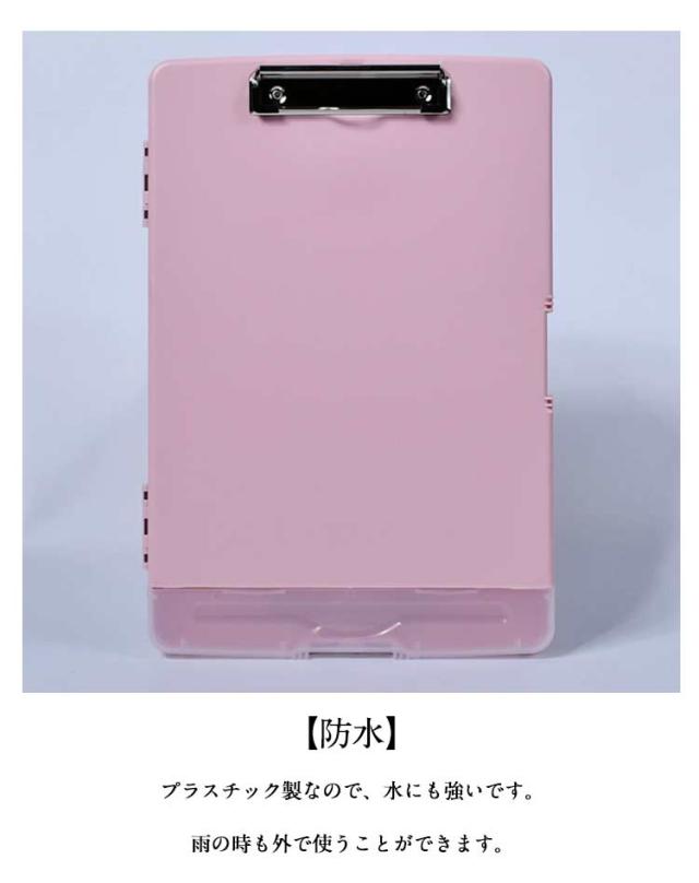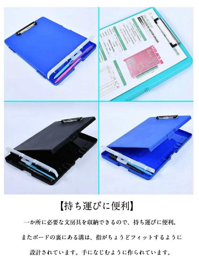 | 【抜群の収納力】 A4用紙は200枚以上収納できます。B5ノートやルーズリーフも収納可能 ボードの下部には筆記用具を収納できるポケットがあります。ペン、消しゴム、定規などを収納できます。 これだけでミーティングやセミナーに参加することが可能です。 *A4のクリアファイルは収納できません。構造上A4用紙よりも大きく作られているためです。ご了承ください。 【持ち運びに便利】 一か所に必要な文房具を収納できるので、持ち運びに便利。 またボードの裏にある溝は、指がちょうどフィットするように設計されています。 手になじむように作られています。 【機能的で使いやすい】 一般的なクリップボードと比べて、使いやすいです。 資料の取り出し、文字を書く作業をスムーズに行うことができます。 研修、工事現場、外部調査、スポーツ等でも使えます。 【保管時も場所をとりません】 裏面にフック用の穴があります。壁掛けができます。 簡単に保管できます。 【防水】 プラスチック製なので、水にも強いです。 雨の時も外で使うことができます。 | |