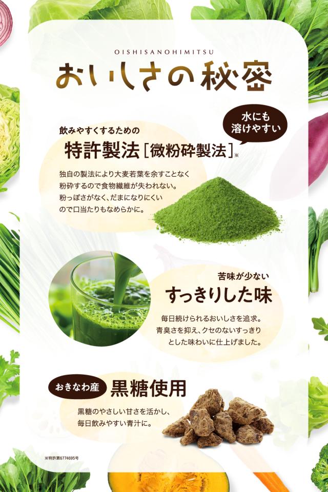 さらに、特許製法「微粉砕製法(特許第6774695号)」を採用し、大麦若葉をまるごと粉砕。