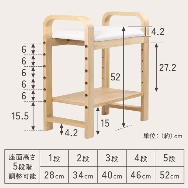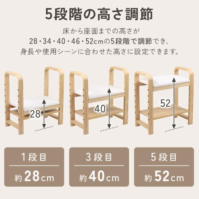 座面の高さは、約6cmごとに28cm、34cm、40cm、46cm、52cmの5段階で調節でき、