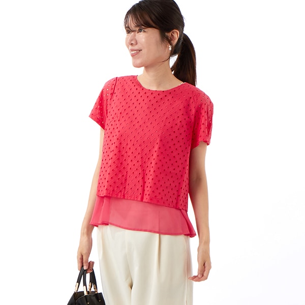 綿レース×シフォン二重ブラウス