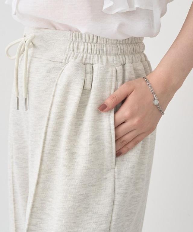 メランジ調のジャージー生地で仕立てたカジュアルなデザインパンツ。伸縮性に優れたリラクシーな穿き心地ながら、センターシームのすっきりとしたレッグラインが特徴的です。ウエストゴム仕様にタックアクセントを加えたコンフォートなフィット感も魅力。カットオフの裾や、チャームやカラビナを装着出来るサイドループもさり気ないポイントです。
