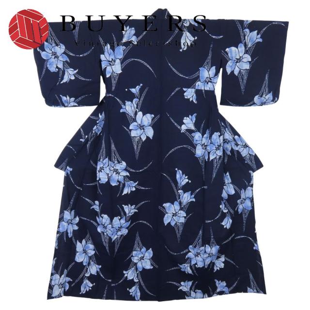 中古 浴衣 綿 藍色 ブルー系 白 花柄 シンプル 大人可愛い 和装 呉服 和服 きもの レディース 女性