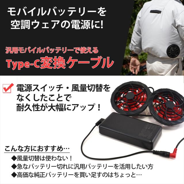 | 商品説明 | ●汎用モバイルバッテリーが空調ウェアのバッテリーとして使えるようになるType-C変換ケーブルです。 ●20V以上の出力のモバイルバッテリーを接続するだけで、20Vの高出力で空調ファンを駆動! 純正バッテリーのように風量が落ちることなく、20Vのパワフルな風量のままファンを動かし続けることができます! ●電源スイッチも風量切替もないシンプル設計だから、どなたでも簡単・手軽に使うことができます。 ●使いやすいL型コネクタを採用。 ケーブルが邪魔になりにくく、断線リスクも軽減。 耐久性の高いケーブル素材を使用しているので、ハードな環境でも長くご使用いただけます。 |