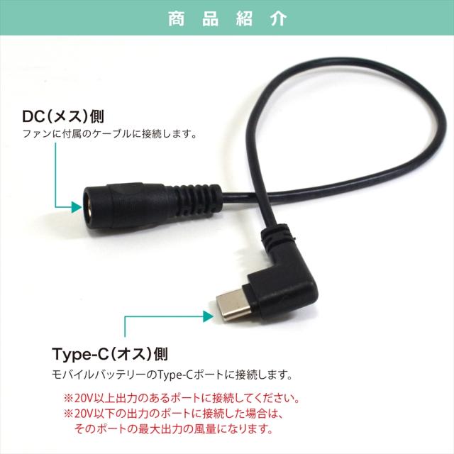 ※モバイルバッテリーの出力が20V以下(12V以上)でも使用できますが、モバイルバッテリーの出力の最大値までの風量になります。