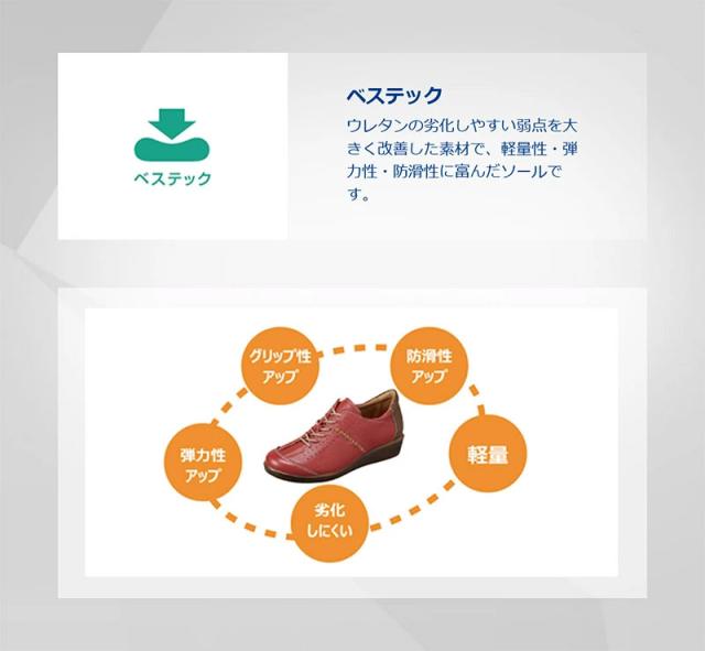 【ベステック(R)ソール】ウレタンの劣化しやすい弱点を大きく改善した素材で、軽量性、弾力性、防滑性に富んだ素材をアウトソールとして採用しています。