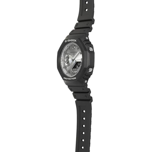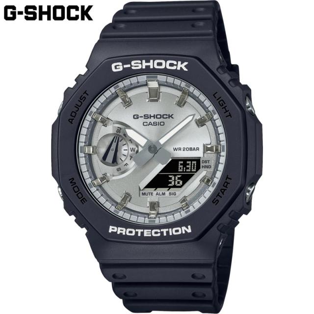 究極の強さを求めて進化を続けるタフネスウオッチG-SHOCKが展開する「2100シリーズ」に、人気のブラックとメタリックカラーを採用したモデルです。初代モデル“DW-5000C”にも採用された“八角形フォルム”を継承したGA-2100は、タフな構造をそのままに厚さ11.8mmの薄型化を果たしたデジタル・アナログコンビネーションモデルです。高剛性を発揮するカーボン繊維入りファインレジンケースは、マット仕上げを採用しています。◆基本情報:・ケースサイズ(縦×横×厚さ):48.5 × 45.4 × 11.8 mm・質量:51 g・ケース・ベゼル材質:カーボン/樹脂・バンド:樹脂バンド・構造:耐衝撃構造(ショックレジスト)、カーボンコアガード構造・防水性:20気圧防水・電池寿命:約3年◆外装:・無機ガラス・バンド装着可能サイズ:145〜215mm・その他:ネオブライト◆時計機能:・ワールドタイム:世界48都市(31タイムゾーン、サマータイム設定機能付き)+UTC(協定世界時)の時刻表示・ストップウオッチ(1/100秒(1時間未満)/1秒(1時間以上)、24時間計、スプリット付き)・タイマー(セット単位:1秒、最大セット:24時間、1秒単位で計測)・時刻アラーム5本・時報・ダブルLEDライト:文字板用LEDライト(スーパーイルミネーター、残照機能、残照時間切替(1.5秒/3秒)付き)、LCD部用LEDバックライト(スーパーイルミネーター、残照機能、残照時間切替(1.5秒/3秒)付き)・ライトカラー:LED:ホワイト・フルオートカレンダー・操作音ON/OFF切替機能・精度:平均月差:±15秒◆その他機能:・12/24時間制表示切替・針退避機能(針が液晶表示と重なって見づらいときは、針を液晶表示の上から一時的に退避させることができます)【発送について】こちらの商品はメーカー取寄せ品の為、発送までにお時間を頂戴しております。メーカーの在庫状況により、まれにご用意できない場合もございます。また、メーカーより届き次第の発送のため、着日指定でのお届けはお受けできませんので予めご了承くださいませ。【プレゼントとしてお買い上げのお客様へ】こちらの商品は、メーカー製造段階にて商品タグまたは化粧箱ラベルなどに、お値段が記載されている可能性がある商品でございます。当店では、金額の塗りつぶしやタグの取り外しなどのサービスは行っておりませんので、あらかじめご了承の上お買い求めをお願い申し上げます。【返品について】品質チェックについては万全を期しておりますが、商品の不良、配送中の破損(配送箱は除く)等につきましては、未使用のまま商品到着後7日以内にご連絡ください。その際は交換品をご用意させていただきますが、在庫状況により発送までお時間をいただいてしまう場合や、生産終了・商品欠品によりお受けできない場合は、ご返金による対応となります。なお、こちらの商品はお客様都合によるキャンセル・返品・交換は受け付けておりませんので、あらかじめご了承の上お買い求めをお願い申し上げます。【モニター用電池について】お客様がお買い上げになるまでの期間に電池は消耗しますので、モニター用電池は、取扱い説明書に記載されている寿命より短いことがあります。又、電池交換は、保証期間内でも有料となります。※モニター用電池とは、お買い上げの時計に組み込まれている電池で、工場出荷時点に、時計の機能や、 性能をチェックするために組み込まれたものです。