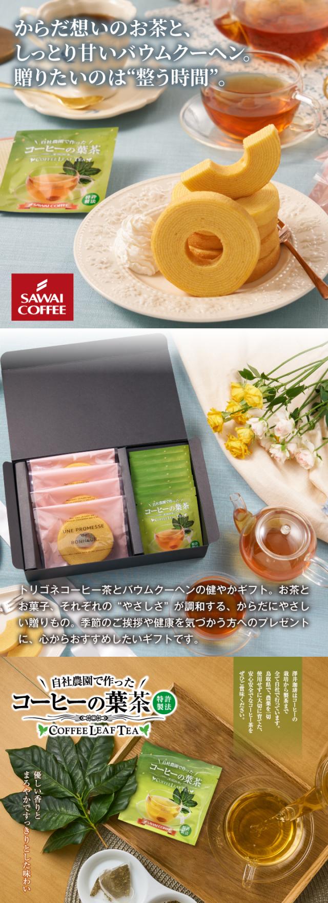 こちらは、農薬不使用で育てたコーヒーの若葉から作られた「トリゴネ茶」と、やさしい甘さの「ミニ・バウムクーヘン」がセットになった、体にやさしいギフトです。お茶はカフェインが少なく、トリゴネリンなどの健康成分を含み、日々の健康をサポート。簡単に淹れられるテトラパック仕様で続けやすく、保存料・着色料も不使用。素材と品質にこだわった、贈り物にも最適な詰め合わせです。