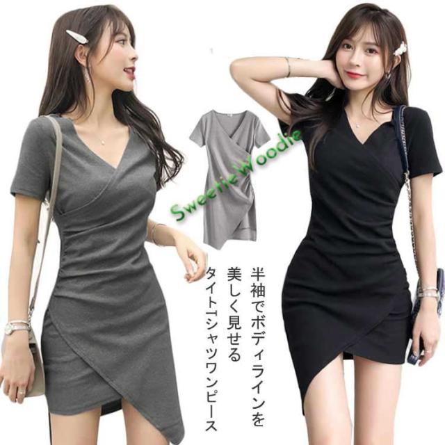 Tシャツ ワンピース Vネック ギャザー 体型カバー プルオーバー 半袖 リラックス 夏 膝丈 ストレッチ 無地 伸縮性 レディース カットソー tシ