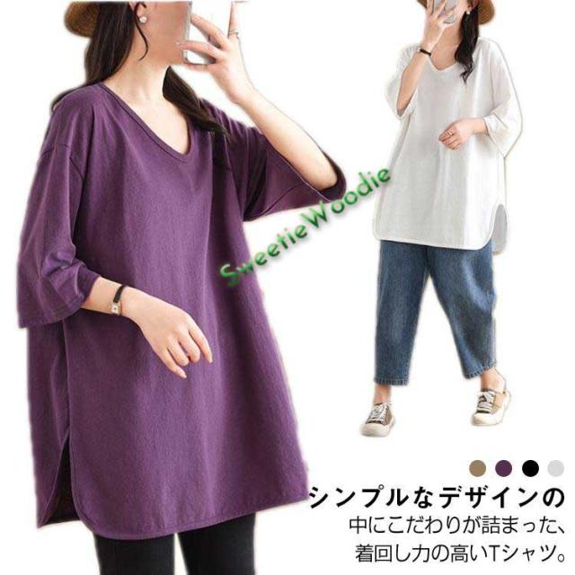 ゆったり 大きめ 春夏 半袖Tシャツ カットソー トップス サイドスリット レディース 無地 ビッグシルエット チュニック Vネック 半袖Tシャツ 長