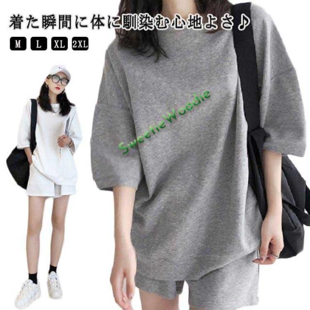 5分袖 レディース レディース セットアップ 春 Tシャツ 無地 スウェット ルームウェア カジュアル 夏 楽ちん 可愛い ゆったり 2点セット 半袖