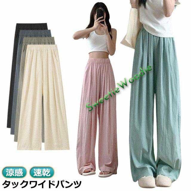 涼感 速乾 レディース ポケットあり ボトムス 涼感 イージーパンツ ロング タック入り ストレート ワイドパンツ ガウチョパンツ リラックス ウエス