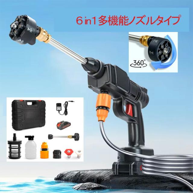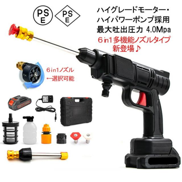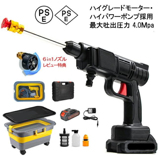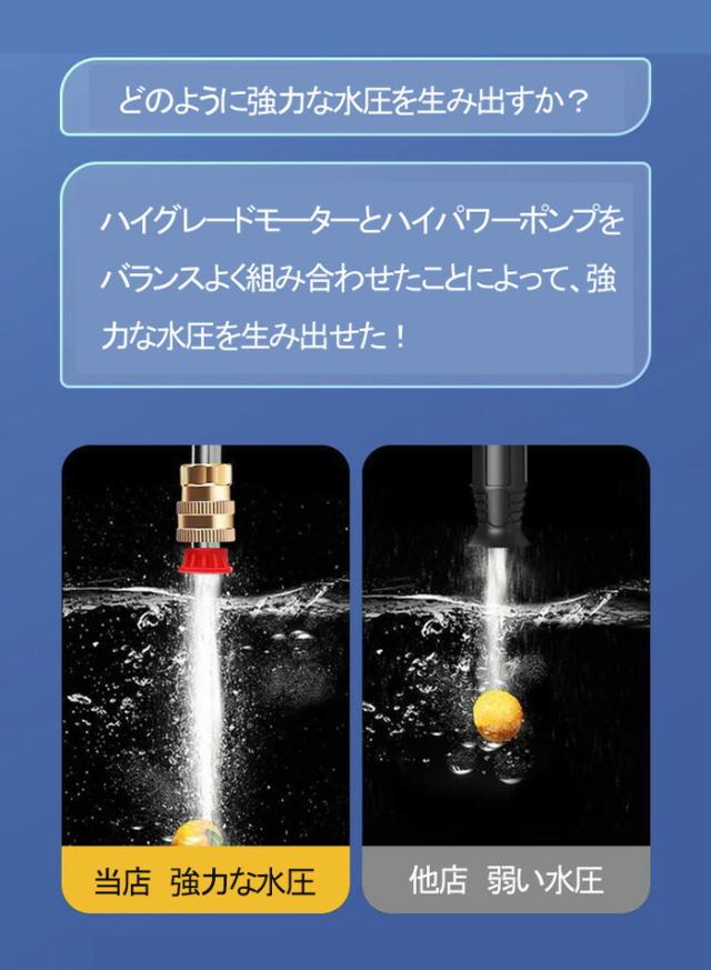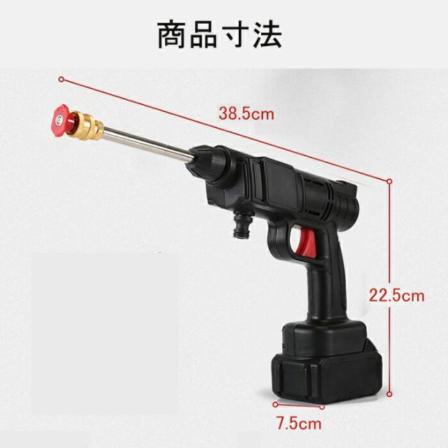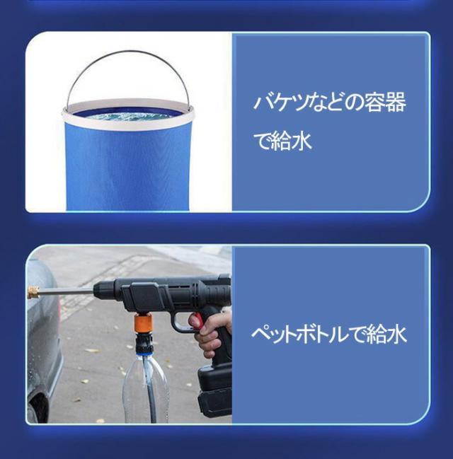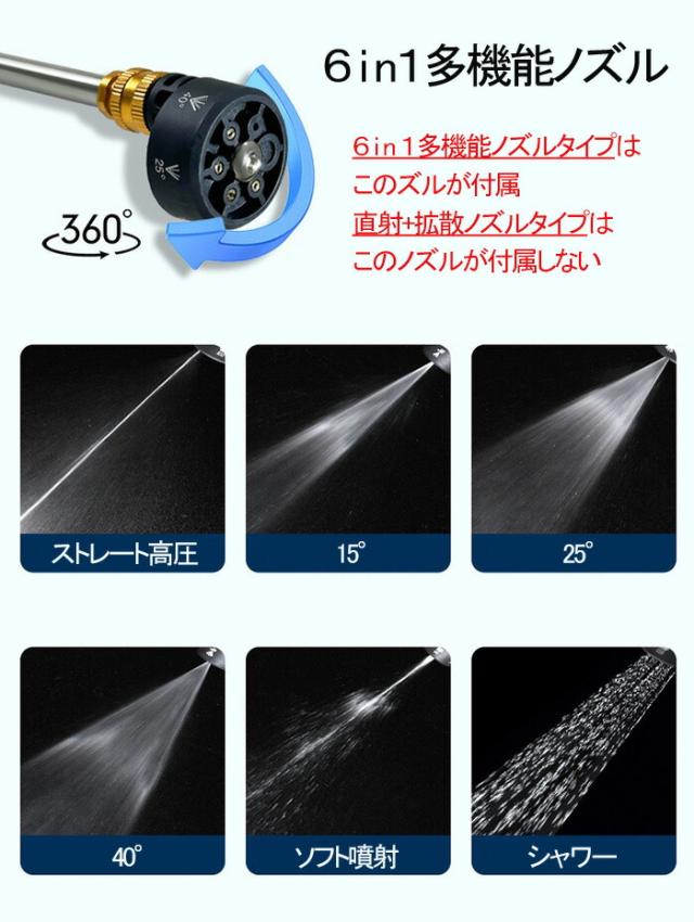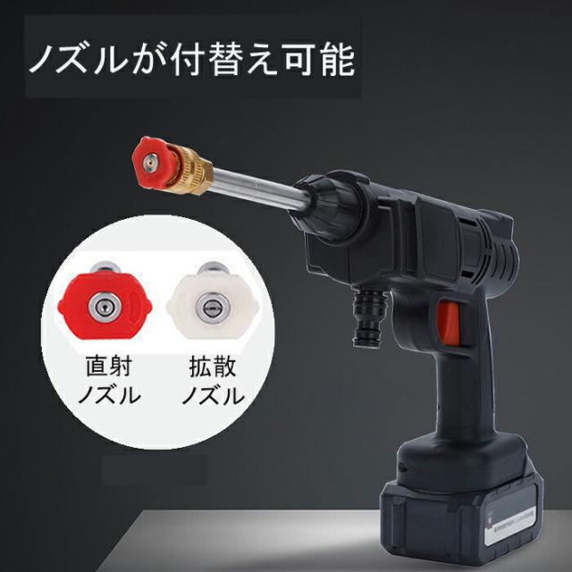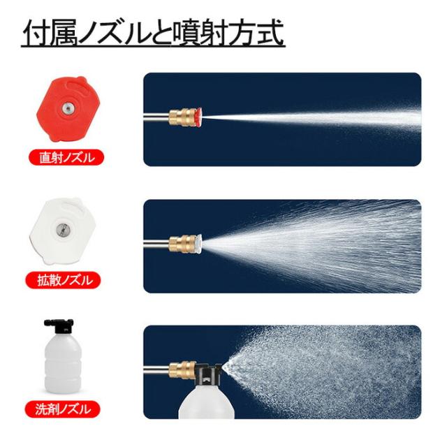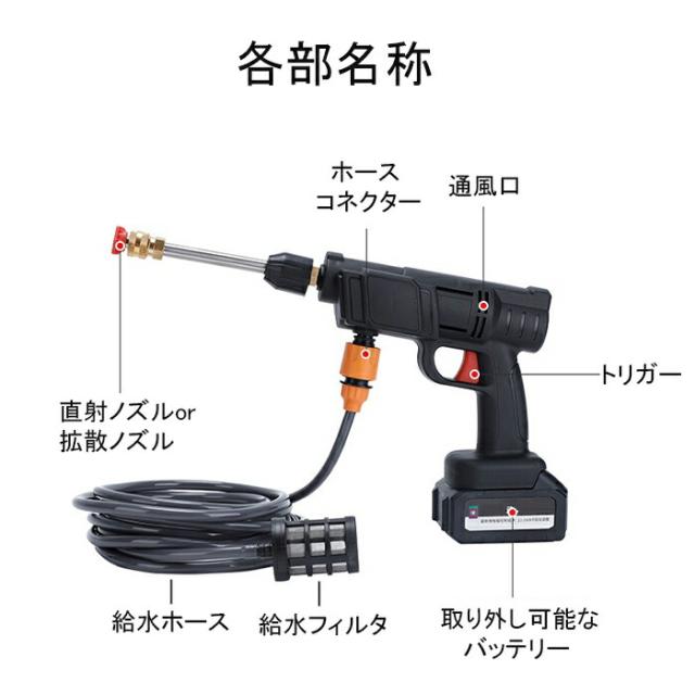 ●セット内容:本体、ノズルアダプタ、直射ノズル、拡散(40度)ノズル、洗剤用ノズル、ペットボトルアダプタ、給水ホース(5m)、給水フィルター、バッテリー(本体のみの場合、バッテリー無し)、充電アダプター(本体のみの場合、充電器無し)、収納ケース、日本語説明書
