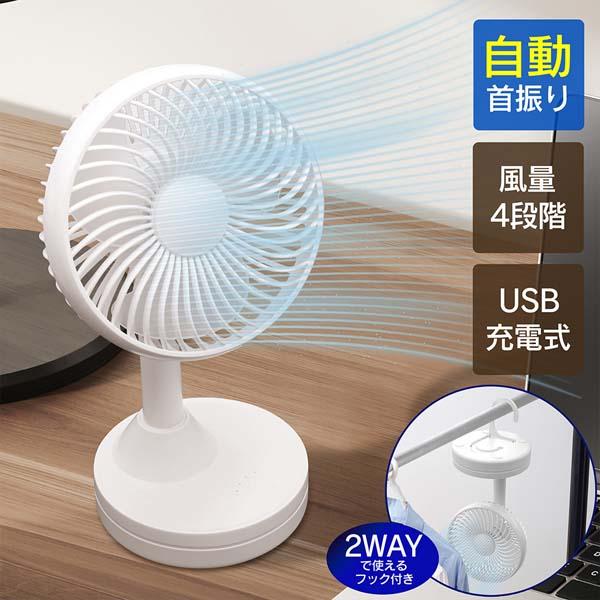送料無料 ! 卓上扇風機 自動首振り デスクファン 静音 風量4段階 角度調整 USB充電式 コードレス 吊るせるフック付き 軽量 【 ミニ扇風機 オフィス 会社 デスクワーク 小型 暑さ対策グッズ 夏物 季節家電 ポイント消化 2000円 以下 の商品】 送料込 60N◇ 静かな扇風機