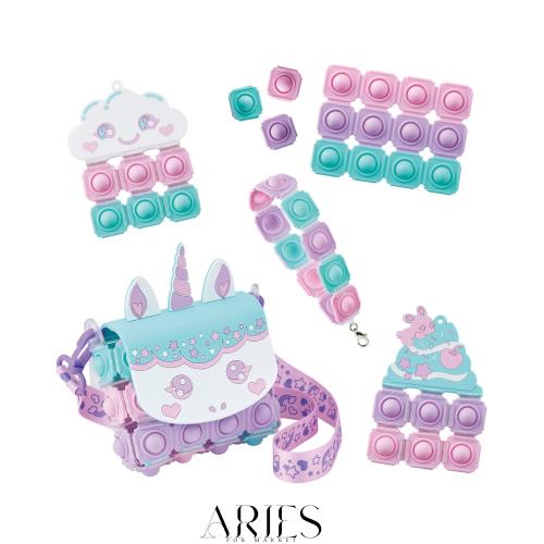 自分だけのオリジナルプッシュポップアイテムが簡単に作れるメイキングトイ「Push Pop Life!!」シリーズより、 「Push Pop Life!! スイートユニコーンバッグセット」が登場! プッシュポップシートをハサミで切って、接続パーツで繋げていくだけで 自分だけのオリジナルプッシュポップアイテムが作れます☆ 「スイートユニコーンバッグセット」では ・ユニコーンバッグ ・アイスクリームプッシュポップ ・ストラップ ・雲プッシュポップ の4アイテムを作ることができます! また、別売りの「Push Pop Life!! アクアマーメイドバッグセット」に付属する 違う色のプッシュポップシートを使うと作れるアイテムの幅が広がります。