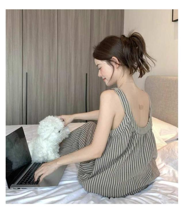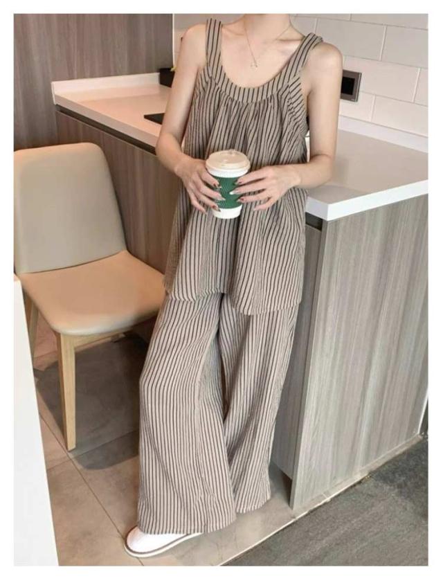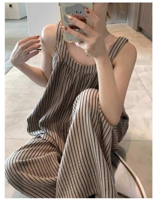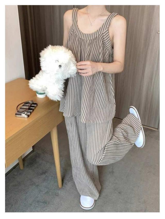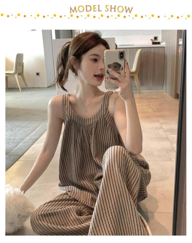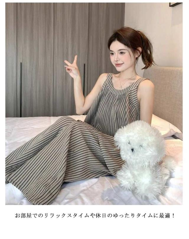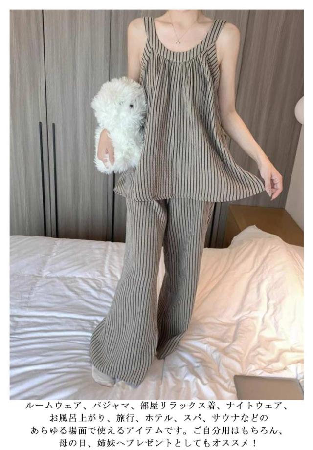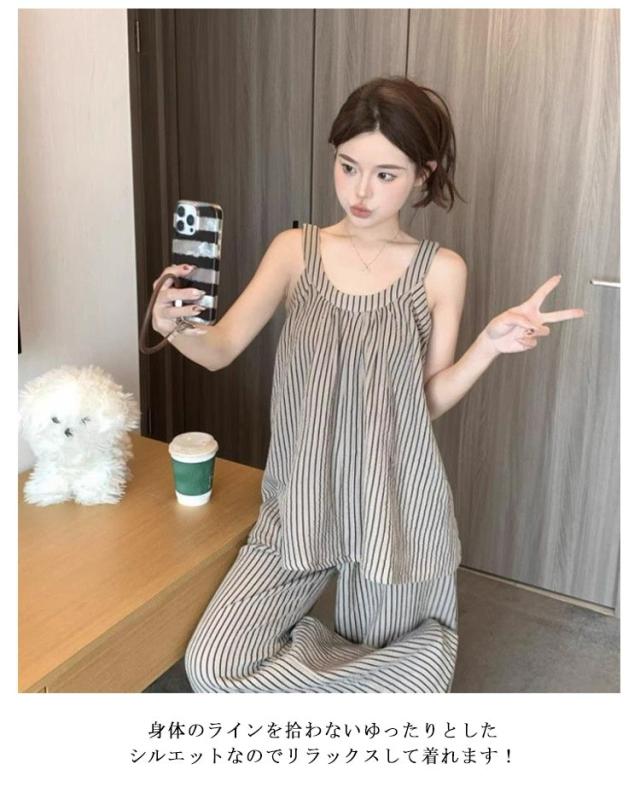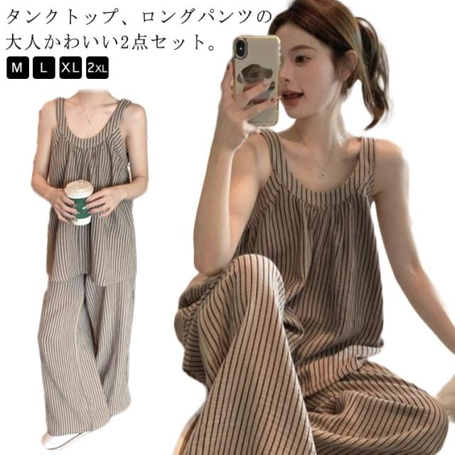 上下セット レディース ノースリーブ カップ付き ストライプ 長ズボン カジュアル パジャマ キャミソール 部屋着 夏用 タンクトップ ゆったり 大きいサイズ 無地 ルームウェア おしゃれ シンプル 可愛い 通気性 ルームウェア