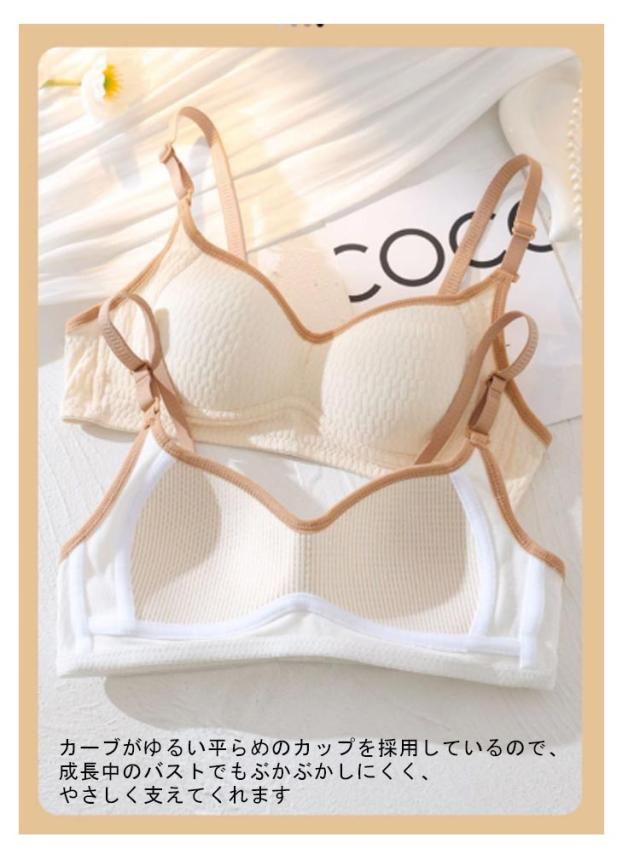| 透けにくい かぶりタイプ ノンワイヤー できるだけ肌の色に近く血色感のある色みや、肌よりも若干暗いベージュ色が最も透けにくいと言われています カーブがゆるい平らめのカップを採用しているので、成長中のバストでもぶかぶかしにくく、やさしく支えてくれます 肩ストラップは長さを調節できるので、お子さまの成長や体形に合わせてご使用いただけます | |