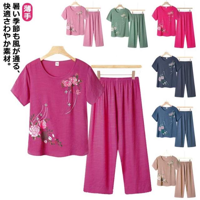 上下セット 七分丈 パジャマ 半袖 襟なし プルオーバー レディース パンツ ルームウエア 薄手 ナイトウエア 薄地 花柄 半ズボン ローズ バラ ク