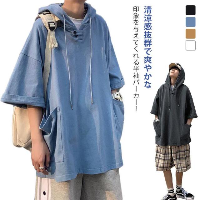 メンズ プルオーバーパーカー 半袖パーカー 半袖 パーカー シンプル 無地 パーカー フード付きtシャツ カジュアル レイヤード風 パーカー おしゃれ