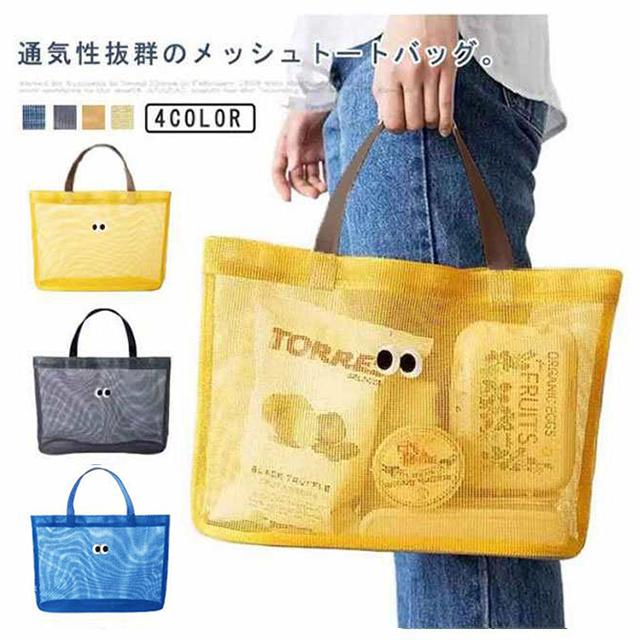 | 通気性抜群のメッシュトートバッグ。 大きく開いて、荷物をどんどん入れることができるので、使いやすい! 季節感のあるメッシュ素材を使った軽量で爽やかなプールバッグ、中身が透けて見えて、何が入っているのか分かりやすいです。 とても軽いので畳んで収納すれば旅行や出張など際のサブバッグとしてもお勧め。 マリンスポーツやプール、レジャーから、フィットネスやヨガに行くときなど幅広くお使い頂けます? | |