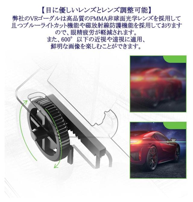 | 【超軽量仕様】一体成型の超薄型で、わずか290g。 【使い方カンタン】スマホをVRゴーグルにセットして、頭にはめるだけですぐに電源無しで楽しめます。 【120度の広角視野体験&600近視/遠視適用】弊社のVRゴーグルは高品質のPMMA非球面光学レンズを採用して且つブルーライトカット機能や磁放射線防護機能を採用しておりますので、眼精疲労が軽減されます。 また、600°以下の近視や遠視に適用、鮮明な画像を楽しむことができます。 視力の悪い人でも、ゴーグルをつけていれば快適に見ることができます。 【目に優しいレンズとレンズ調整可能】弊社のVRゴーグルは高品質のPMMA非球面光学レンズを採用して且つブルーライトカット機能や磁放射線防護機能を採用しておりますので、眼精疲労が軽減されます。 また、600°以下の近視や遠視に適用、鮮明な画像を楽しむことができます。 【快適な装着感】頭にぴったりとフィットするのでズレや落ちる心配もありまん、長期間使用しても頭頸部に負担がかかりません。 【優れた通気性と熱放散】VRゴーグルの両側にスマートフォン用の通気孔を設置し、スマートフォンを固定するためのブラケットは中空のデザインを採用しています。 これにより、VRソフトウェアの実行時にスマートフォンが過熱によって画面がフリーズしたりぼやけたりすることがなくなり、よりスムーズで快適で長持ちするVR体験を得ることができます。 | |