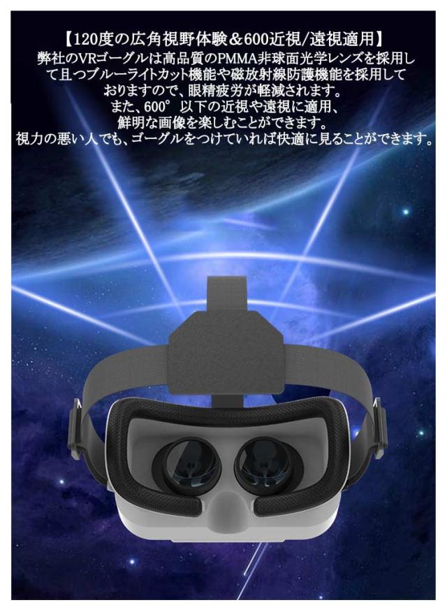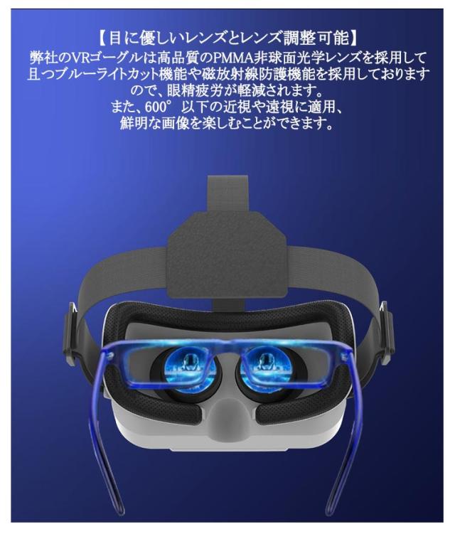 | 【超軽量仕様】一体成型の超薄型で、わずか205g。 【使い方カンタン】スマホをVRゴーグルにセットして、頭にはめるだけですぐに電源無しで楽しめます。 【120度の広角視野体験&600近視/遠視適用】弊社のVRゴーグルは高品質のPMMA非球面光学レンズを採用して且つブルーライトカット機能や磁放射線防護機能を採用しておりますので、眼精疲労が軽減されます。 また、600°以下の近視や遠視に適用、鮮明な画像を楽しむことができます。 視力の悪い人でも、ゴーグルをつけていれば快適に見ることができます。 【目に優しいレンズとレンズ調整可能】弊社のVRゴーグルは高品質のPMMA非球面光学レンズを採用して且つブルーライトカット機能や磁放射線防護機能を採用しておりますので、眼精疲労が軽減されます。 また、600°以下の近視や遠視に適用、鮮明な画像を楽しむことができます。 【快適な装着感】頭にぴったりとフィットするのでズレや落ちる心配もありまん、長期間使用しても頭頸部に負担がかかりません。 【優れた通気性と熱放散】VRゴーグルの両側にスマートフォン用の通気孔を設置し、スマートフォンを固定するためのブラケットは中空のデザインを採用しています。 これにより、VRソフトウェアの実行時にスマートフォンが過熱によって画面がフリーズしたりぼやけたりすることがなくなり、よりスムーズで快適で長持ちするVR体験を得ることができます。 | |
