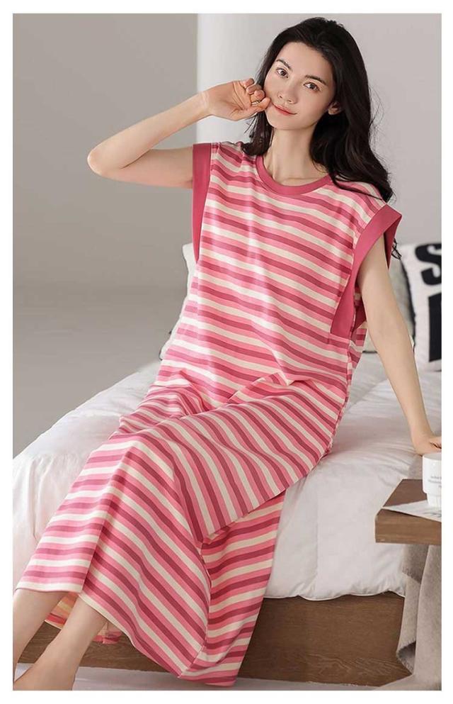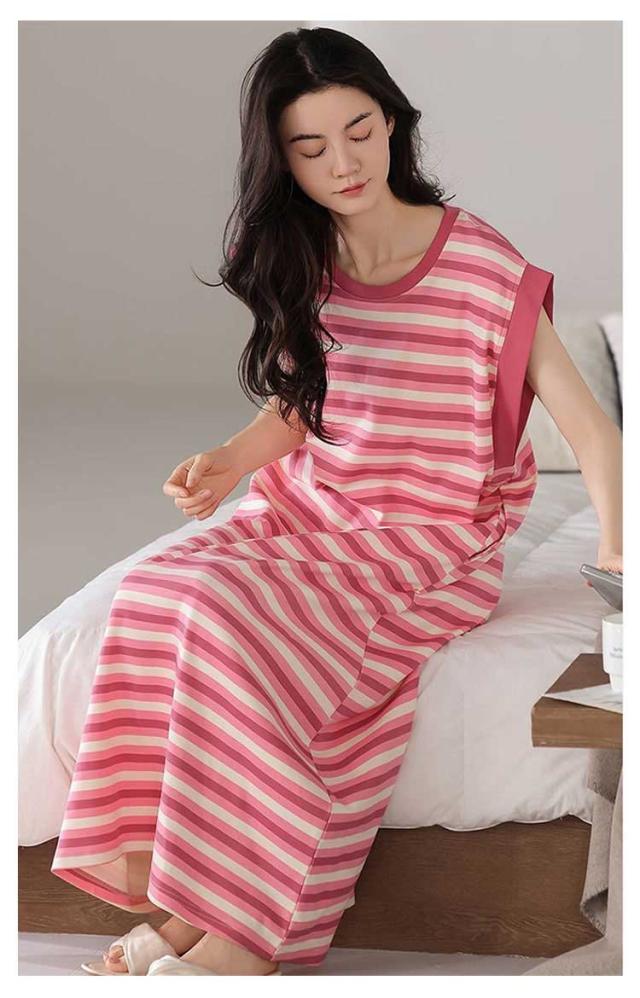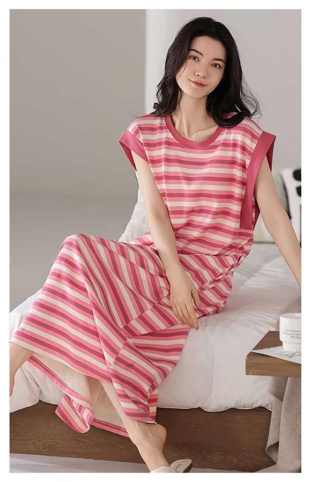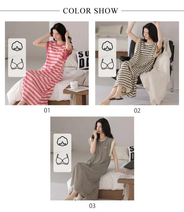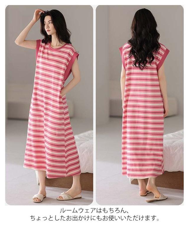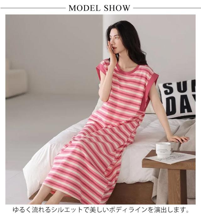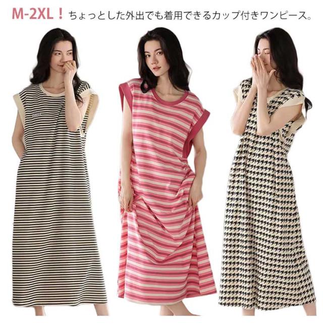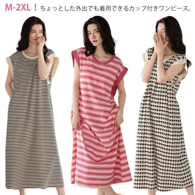 カップ付きワンピース ノースリーブ レディース 部屋着 ルームワンピース カップ付きワンピース ロング丈 袖なし Tシャツワンピース ボーダー柄 薄手 ルームワンピース 20代 30代 40代 パジャマ 春夏 ゆったり 寝巻き ナイトウェア