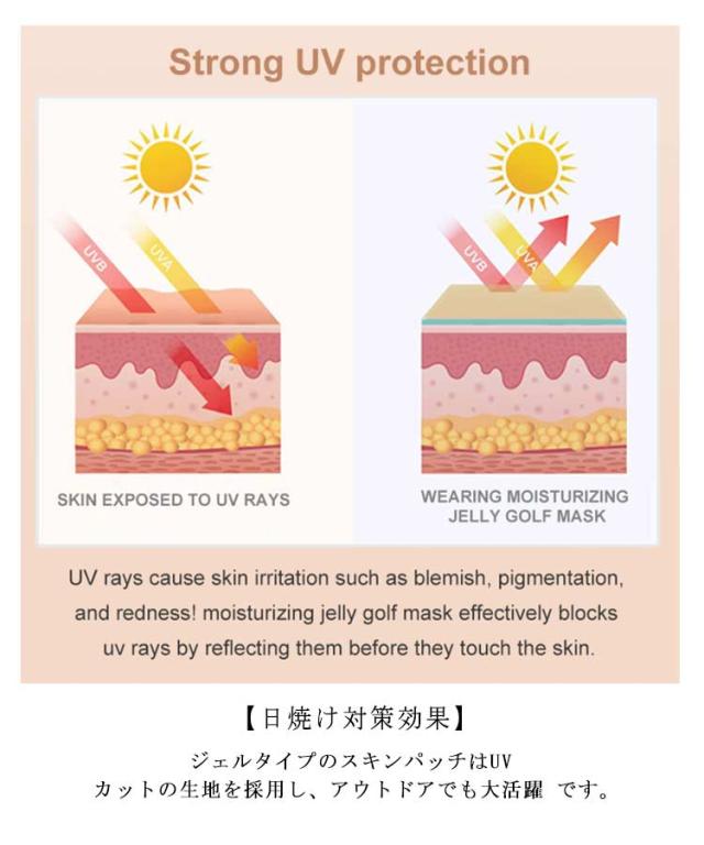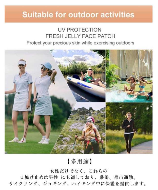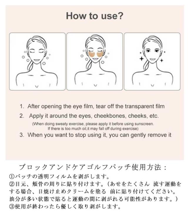 | 太陽から守り抜く!ゴルフを愛するあなたに! 日焼け止めより効果がある 【日焼け対策効果】ジェルタイプのスキンパッチはUV カットの生地を採用し、アウトドアでも大活躍 です。 【耐久性と通気性】パッチは頑丈で伸縮性のある素材で 作られており、破れにくく、吸汗性と通気性も良く、高 温多湿の環境でも快適な体験を提供します。 【広い被覆面積】大きなサイズのワッペンで、頬だけで なく目の周りもカバーでき、包括的な日焼け防止を提供します。 【スキンケアのメリット】日焼け止めの他に、ブラダー ラックエキス、ローズマリーエキス、ツボクサエキスな ど、肌の鎮静と水分補給を改善する成分も含まれています。 【多用途】女性だけでなく、これらの日焼け止めは男性 にも適しており、乗馬、都市通勤、サイクリング、ジョギング、ハイキング中に保護を提供します。 ブロックアンドケアゴルフパッチ使用方法: 1.パッチの透明フィルムを剥がします。 2.目元、頬骨の周りに貼り付けます。(あせをたくさん 流す運動をする場合、日焼け止めクリームを塗る 前に貼り付けてください。油分が多い状態で貼ると運動の間に剥がれる可能性があります。) 3.使用が終わったら優しく取り剥がします。 | |