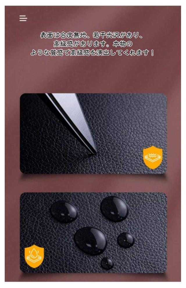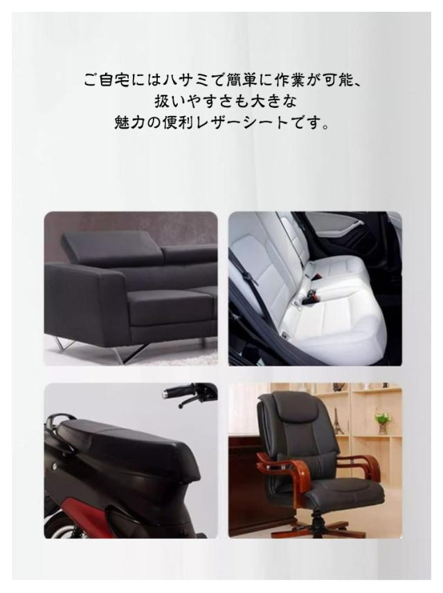 | 貼るレザー!防水、柔らかめ、接着性抜群! 丈夫で柔らかい合皮レザー生地、伸びが良いので、曲面にも馴染ませることができます。 表面は合皮無地、若干光沢があり、高級感があります。本物のような質感で高級感を演出してくれます! 合皮レザー生地の裏面が接着シールになっており、様々な物に貼り付けることが出来ます。接着剥の粘着力が優れていて簡単に剥がれません。 ご自宅にはハサミで簡単に作業が可能、扱いやすさも大きな魅力の便利レザーシートです。 豊富なカラーバエーション気軽に、インテリアのイメージチェンジも楽しめます!自分好みのインテリアが実現! 補修シールとして自転車のサドル・車のシート・バイクのシート・ソファーのシートなどの張り替え、修補、破れ隠し、椅子の座面張替。壁紙、インテリア、DIYなどにも使用でき、色々な用途にご利用いただくことができます。化粧箱、ギフトケースなどに貼るにも最適です。 | |