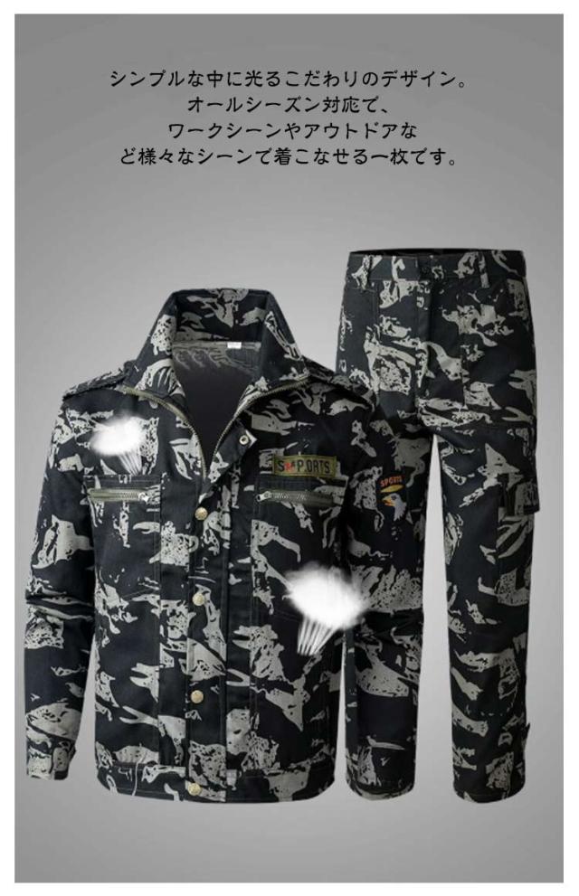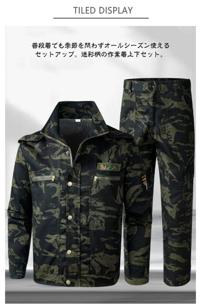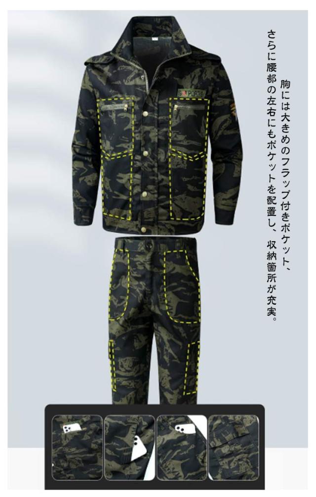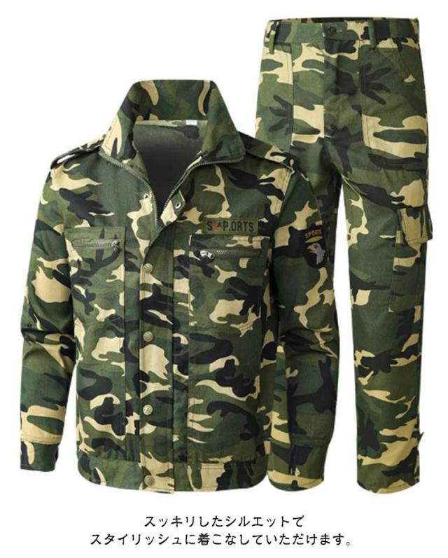 | M-4XL!普段着でも季節を問わずオールシーズン使えるセットアップ。迷彩柄の作業着上下セット。 スッキリしたシルエットでスタイリッシュに着こなしていただけます。 胸には大きめのフラップ付きポケット、さらに腰部の左右にもポケットを配置し、収納箇所が充実。 シンプルな中に光るこだわりのデザイン。オールシーズン対応で、ワークシーンやアウトドアなど様々なシーンで着こなせる一枚です。 | |