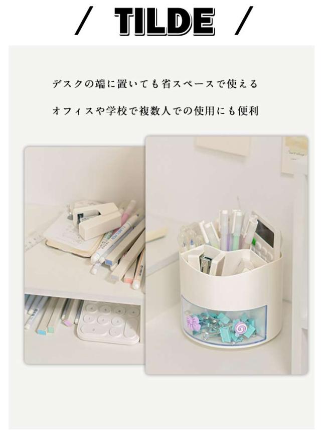 | 引き出し付き大容量の360度回転式ペン立て。 360度回転でどの角度からでも取り出しやすい 4つのポケットでアイテムを分類収納可能 底部に小さな引き出し付き。 段違いデザインで小物も見やすく取り出しやすい デスクの端に置いても省スペースで使える オフィスや学校で複数人での使用にも便利 | |
