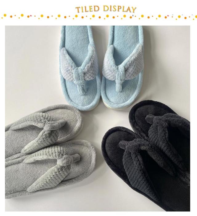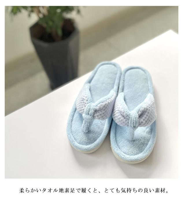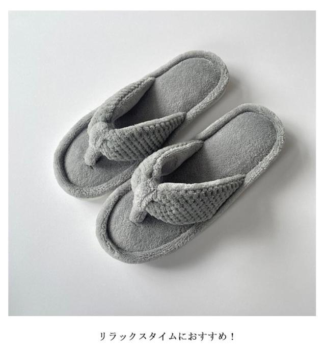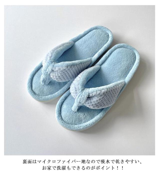 | マイクロファイバー生地トングサンダルスリッパ。 裏面はマイクロファイバー地なので吸水で乾きやすい、お家で洗濯もできるのがポイント!! 柔らかいタオル地素足で履くと、とても気持ちの良い素材。 リラックスタイムにおすすめ! | |
