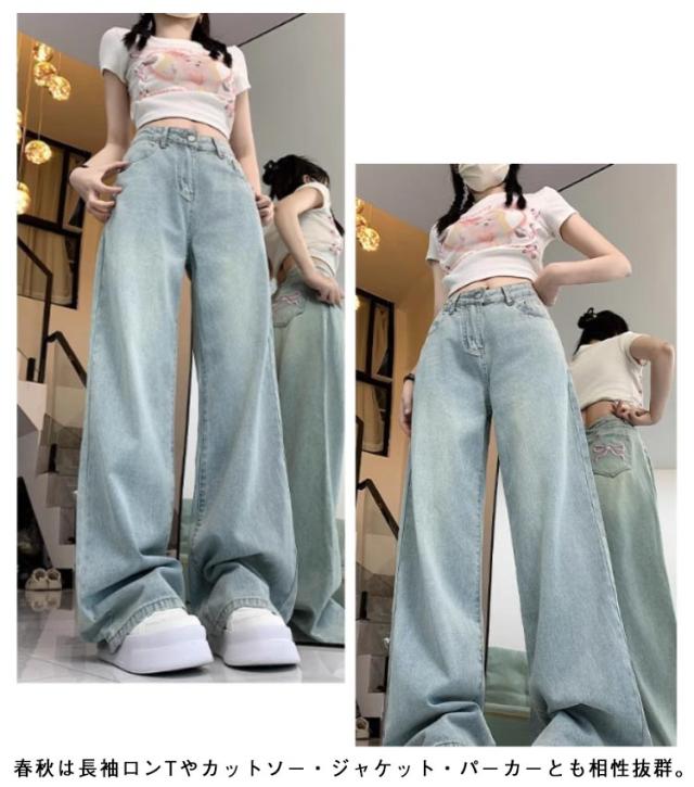 ワイドパンツ レディース デニム デニムパンツ シンプル カジュアル おしゃれ ボトムス リボン かわいい 春夏 ハイウエスト ジーンズ 大きいサイズ おしゃれ ロングパンツ 秋冬 無地 春夏 脚長効果 ゆったり 体型カバー 大人女性