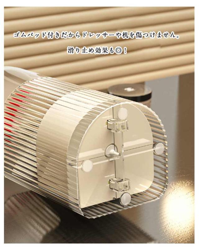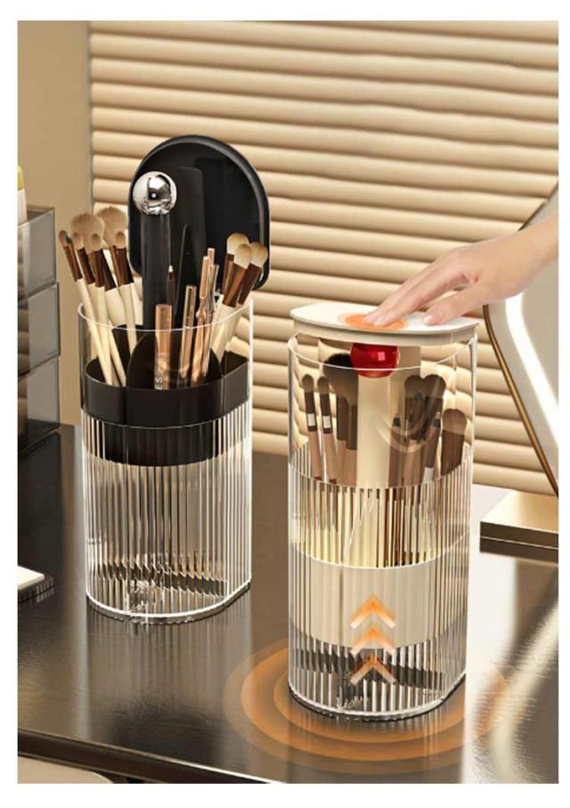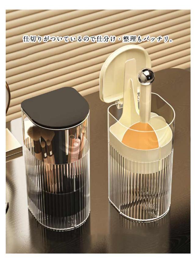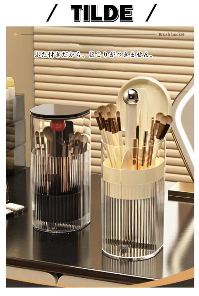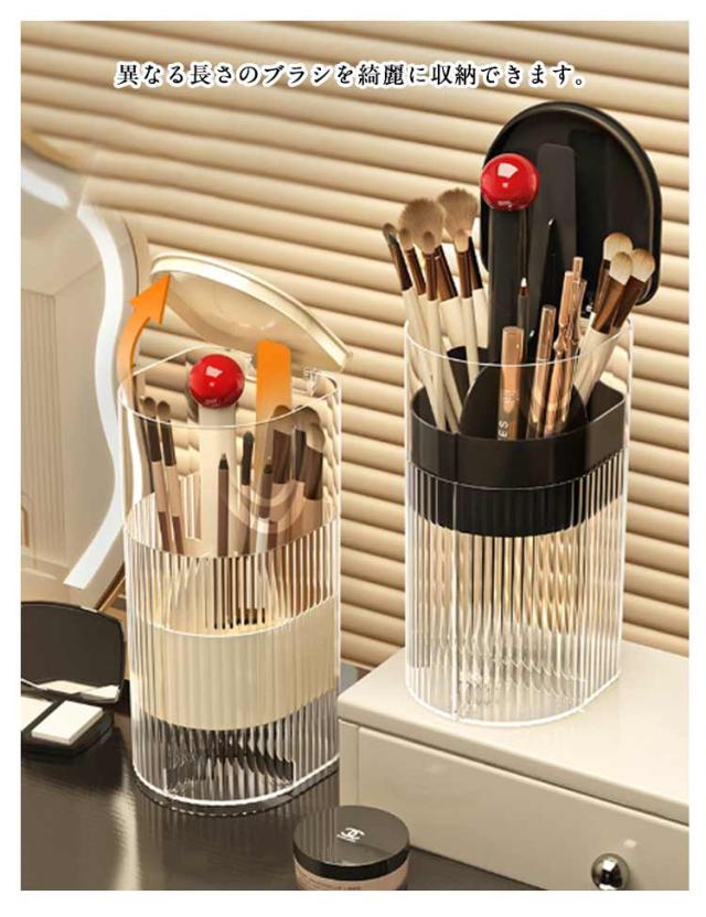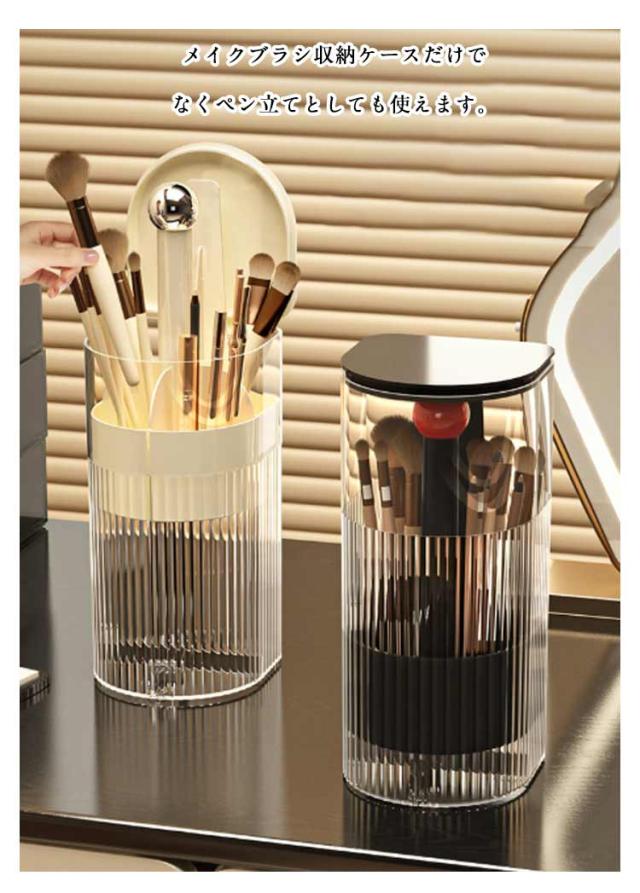 | ワンタッチで開閉可能のメイクブラシスタンド。 ふた付きだから、ほこりがつきません。 異なる長さのブラシを綺麗に収納できます。 仕切りがついているので仕分け・整理もバッチリ。 ゴムパッド付きだからドレッサーや机を傷つけません。滑り止め効果も◎! メイクブラシ収納ケースだけでなくペン立てとしても使えます。 | |