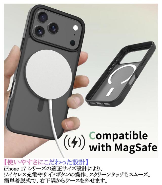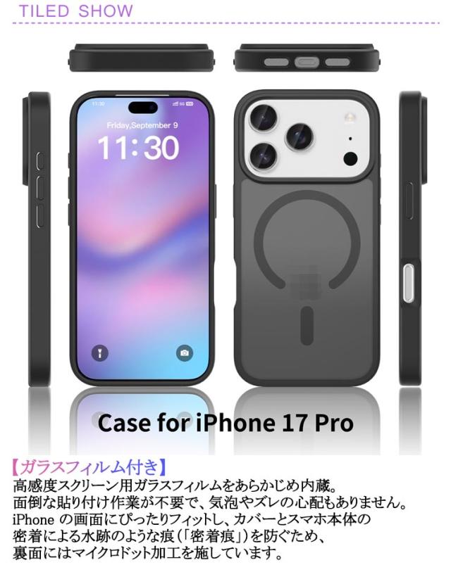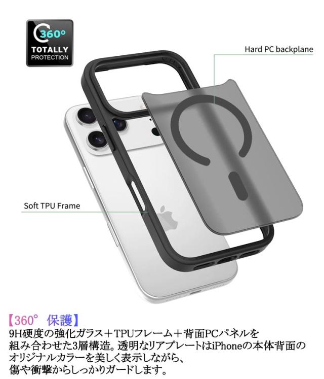 | 【360°保護】 9H硬度の強化ガラス+TPUフレーム+背面PCパネルを組み合わせた3層構造。透明なリアプレートはiPhoneの本体背面のオリジナルカラーを美しく表示しながら、傷や衝撃からしっかりガードします。 【ガラスフィルム付き】 高感度スクリーン用ガラスフィルムをあらかじめ内蔵。面倒な貼り付け作業が不要で、気泡やズレの心配もありません。iPhone の画面にぴったりフィットし、カバーとスマホ本体の密着による水跡のような痕(「密着痕」)を防ぐため、裏面にはマイクロドット加工を施しています。 【耐衝撃TPU素材】 柔軟な衝撃吸収性のあるTPUバンパーが360°フルボディを保護。四隅を強化設計しており、落下時の衝撃を効果的に軽減します。縁の盛り上がり加工で、画面とカメラをあらゆる角度からの衝撃から守ります。 【使いやすさにこだわった設計】 iPhone 17 シリーズの適正サイズ設計により、ワイヤレス充電やサイドボタンの操作、スクリーンタッチもスムーズ。簡単着脱式で、右下隅からケースを外せます。 | |