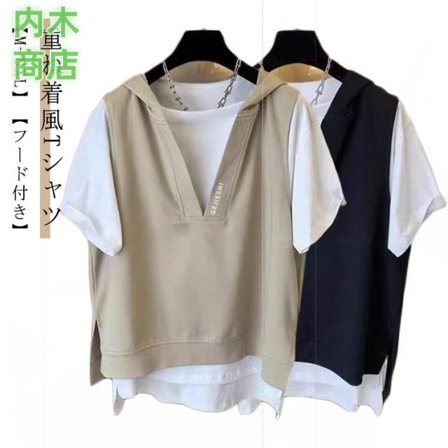 | 【M-8XL】【重ね着風Tシャツ】【フード付き】 お洒落なレイヤード風フード付きTシャツ。 オシャレなドロップショルダーの半袖トップス。 アクセントはベストとフード付パーカー風! お気に入りのボトムと合わせるだけで、かさばることなくレイヤードスタイルをお楽しみいただけます。 | |