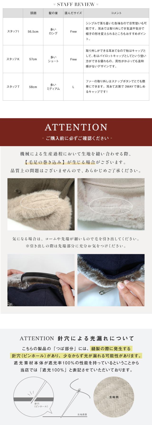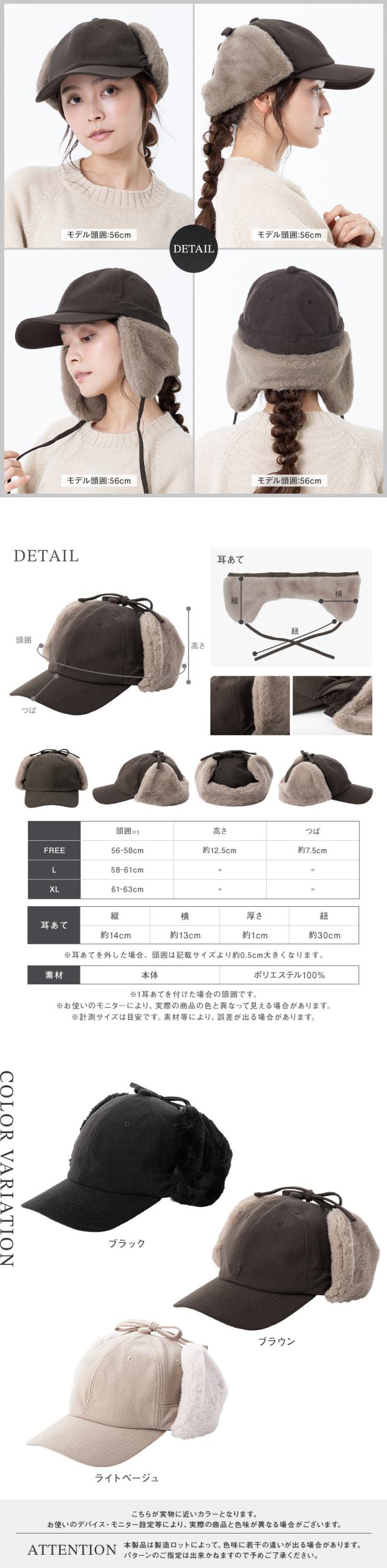 | ・高さはモデル着用時の高さを記載しています。 ・記載されている頭囲・耳あてのサイズは、耳あてを付けた状態の計測値です。 ・頭囲・高さのサイズ表記は、5ミリ前後の誤差が生じる場合があります。計測サイズは目安としてお考えください。 ・お取り扱いの前に品質ネームタグの記載内容をご確認ください。 ・ご覧頂くモニターの発色具合によって実物と色が異なって見える場合があります。 ・商品単体の画像が実際の商品と色合いが近いものとなっておりますので、ご参照ください。 ・同商品でも、染色過程で色味が多少変わる場合があります。 ・後頭部の調節テープで微調節が可能です。 ・取り外し可能な耳あて付きです。 |