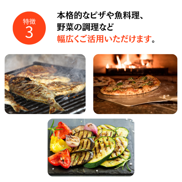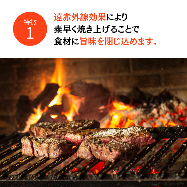 食材を乗せて焼くだけ!遠赤外線効果でお肉はもちろん、魚料理、野菜が美味しく焼き上がるとお客様からもご好評いただいております。